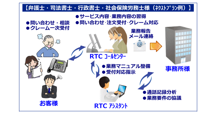 弁護士・司法書士・行政書士・社会保険労務士事務所など、士業サービスに於ける電話受付業務の負担を軽減し、人件費や経費削減にも貢献します。また、ネクストプランでは長期間に渡りご契約頂くことで、外部委託先としての受付代行窓口の対応精度も向上し、各弁護士事務所・司法書士事務所固有の代行業務フローに柔軟に対応して進化します。